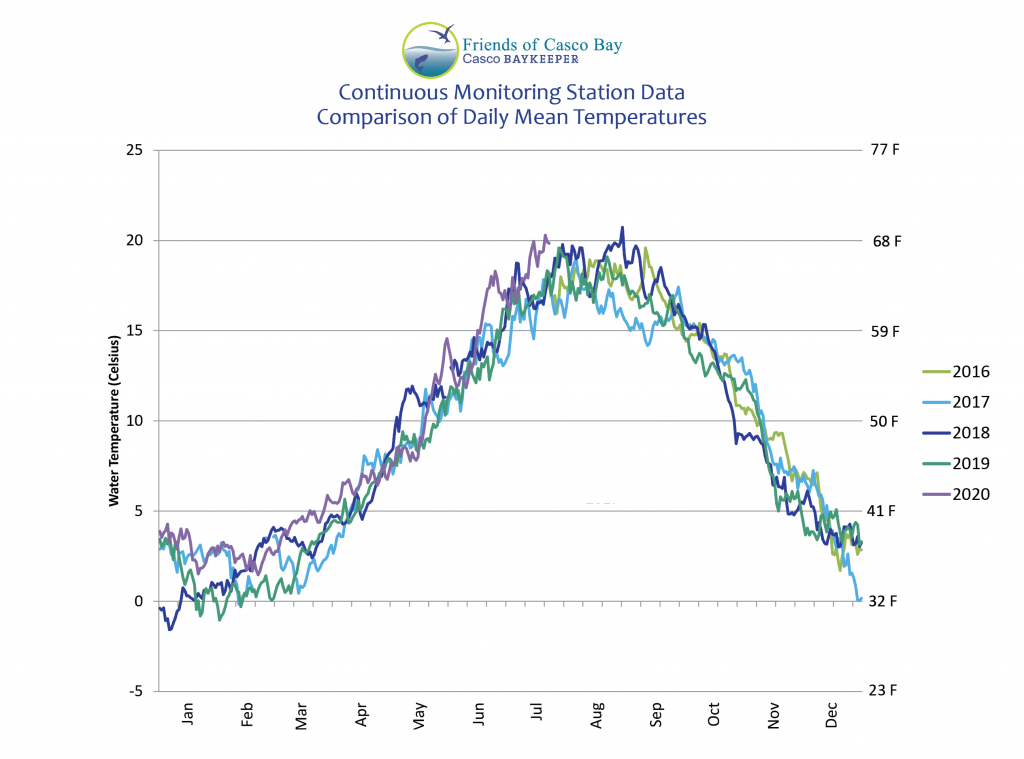 In addition to collecting hourly data, for nearly 30 years, we have been spot-checking sites in the Bay. The temperature data from our three Sentinel Sites (see graph below for annual average, data collected May through October each year) show an upward trend as temperatures in Casco Bay have risen by 2.4° Fahrenheit [1.3° Celsius].