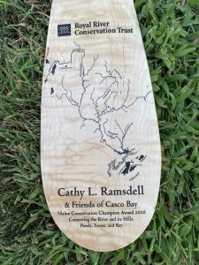 Alan then gave beautifully-inscribed wooden paddles representing the Conservation Champion Award to Cathy and to Friends of Casco Bay Board Member Ann Thayer, who has long volunteered as our liaison with RRCT.