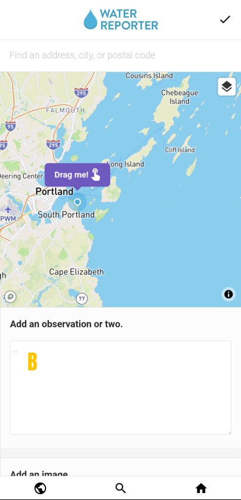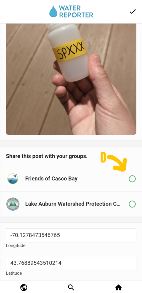 - D. Share your post with us to make sure it displays on our data map. Tap the small green circle next to “Friends of Casco Bay”. You will know you clicked the circle because it will fill in.