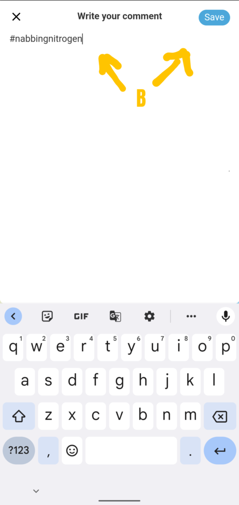 - B. Click the box titled “Add an observation or two”, located below the map. A new, mostly blank screen opens. Type “#nabbingnitrogen”.