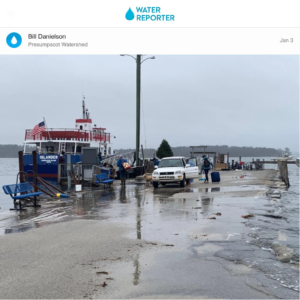 Water Reporter Bill Danielson documented high tide in Casco Bay flooding over the edges of Chebeague’s Stone Wharf. High water events have become common at the wharf, leaving island residents to grapple with the need to raise the wharf in the face of rising sea levels. Bill is one of more than 400 volunteer Water Reporters who help us keep an eye on Casco Bay.
