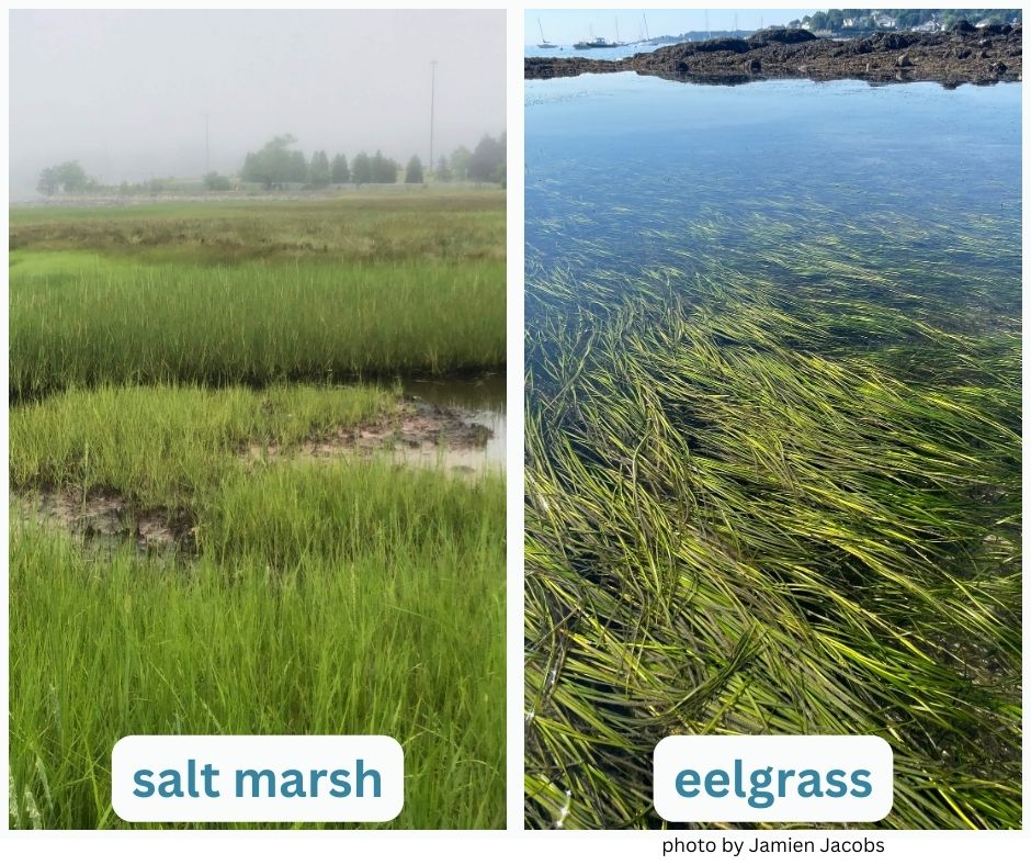 Eelgrass grows in shallow underwater areas of bays and inlets; salt marshes resemble grassy fields and can stretch inland.