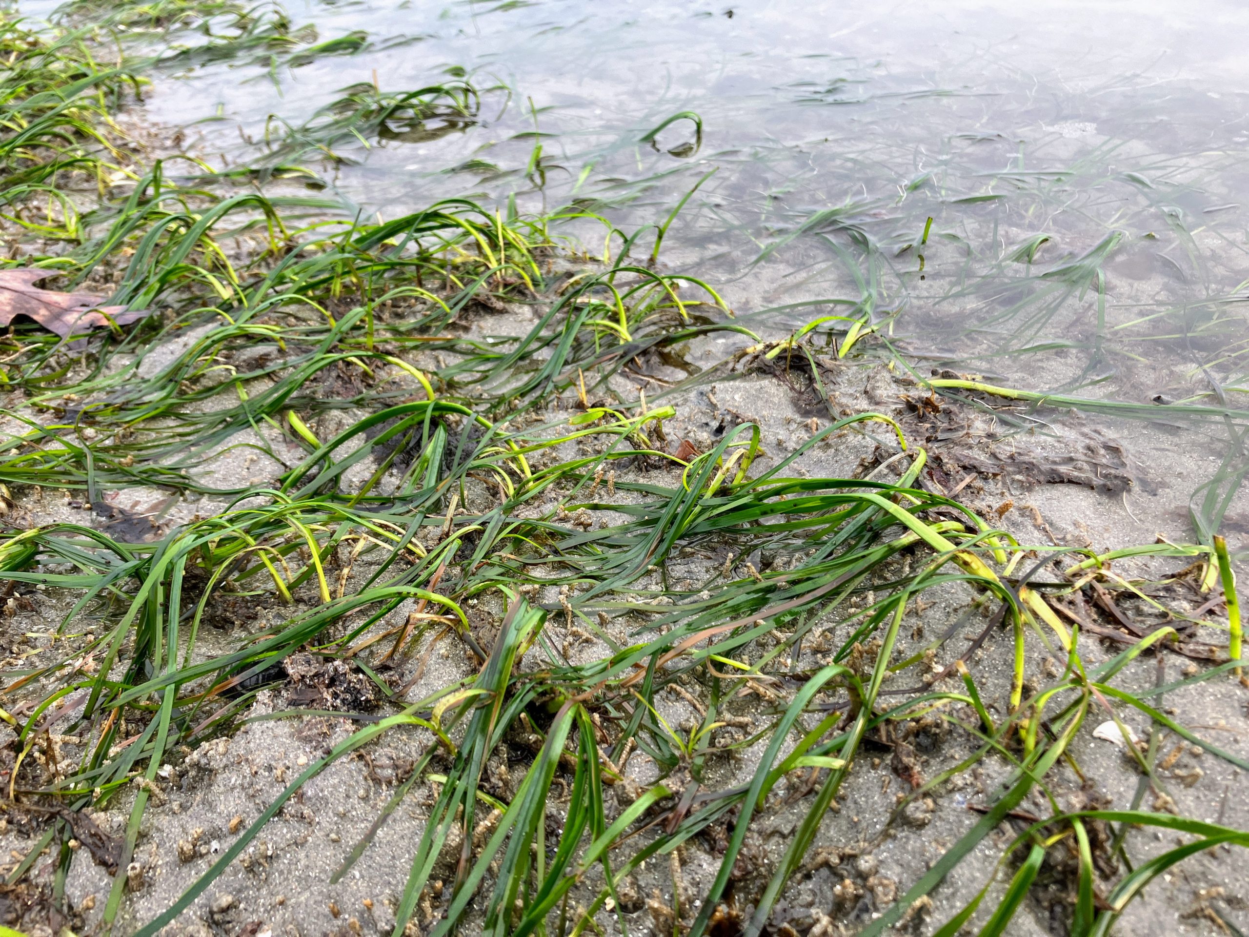 Compared to salt marsh grass, which stands upright and out of the water, eelgrass lays flat when exposed and needs to stay submerged to survive.