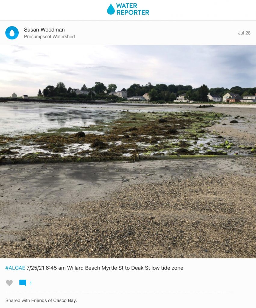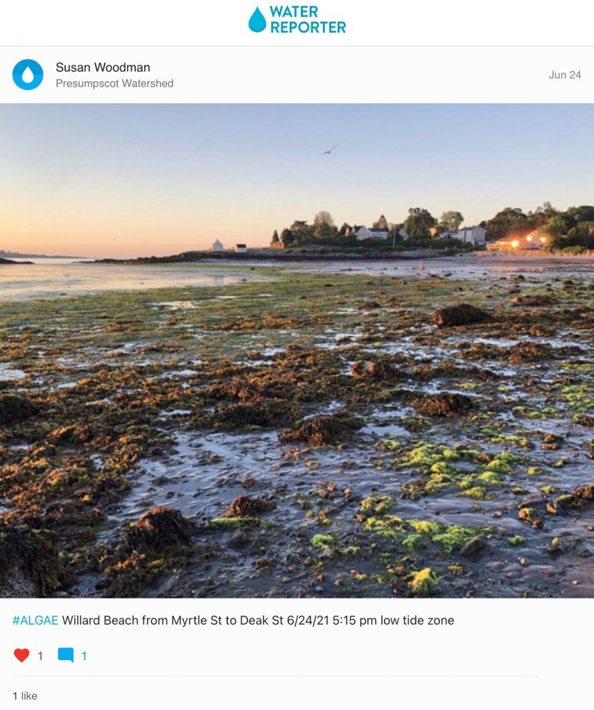 When she is not paddling in her kayak, Susan can often be found a mile from her home walking along Willard Beach where she’s been using Water Reporter to document algal blooms and coastal erosion. One of her recent posts from June 24, shows a field of green algae carpeting the beach’s intertidal zone. A month later, Susan captured another similarly sized bloom at the same location on July 25.